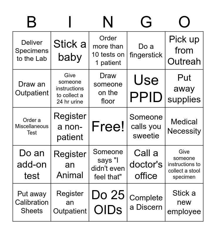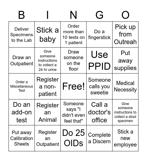 This bingo card has a free space and 24 words: Register an Animal, Register an Outpatient, Draw someone on the floor, Put away Calibration Sheets, Pick up from Outreah, Deliver Specimens to the Lab, Draw an Outpatient, Stick a baby, Someone calls you sweetie, Someone says "I didn't even feel that", Use PPID, Order a Miscellaneous Test, Call a doctor's office, Give someone instructions to collect a stool specimen, Give someone instructions to collect a 24 hr urine, Complete a Discern, Medical Necessity, Order more than 10 tests on 1 patient, Put away supplies, Register a non-patient, Stick a new employee, Do an add-on test, Do a fingerstick and Do 25 OIDs.