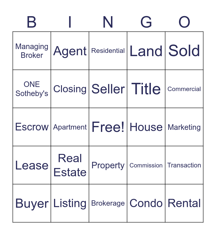 This bingo card has a free space and 24 words: Real Estate, Listing, Seller, Buyer, Sold, Managing Broker, ONE Sotheby's, Agent, House, Property, Title, Escrow, Commission, Transaction, Closing, Condo, Marketing, Residential, Commercial, Apartment, Rental, Lease, Land and Brokerage.