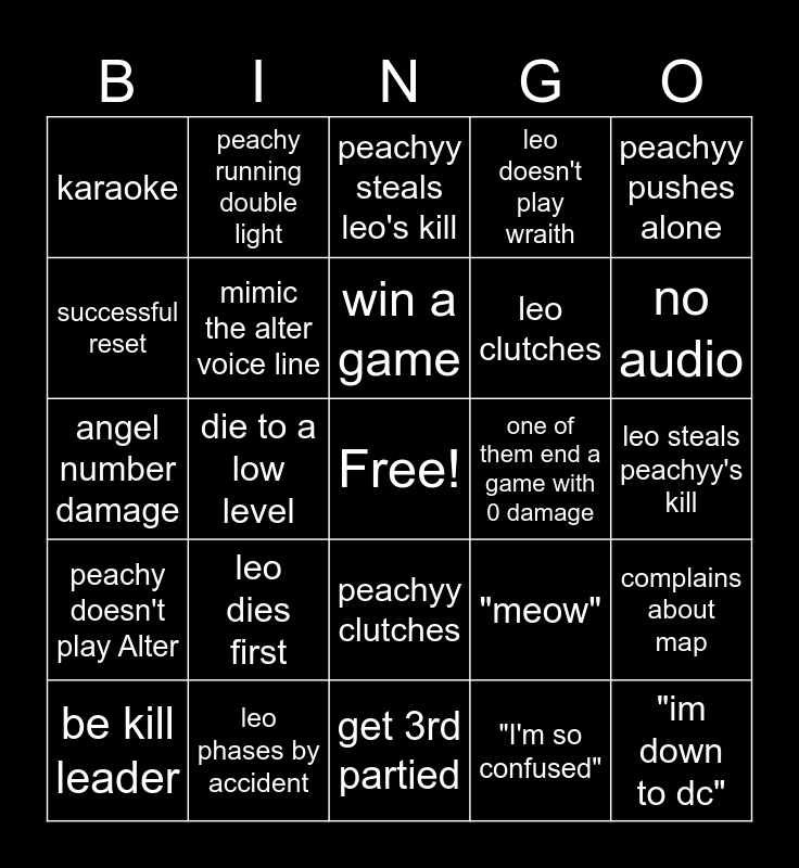 This bingo card has a free space and 24 words: leo dies first, leo phases by accident, win a game, be kill leader, peachyy pushes alone, karaoke, successful reset, peachy running double light, one of them end a game with 0 damage, peachyy clutches, leo clutches, angel number damage, "meow", complains about map, mimic the alter voice line, "I'm so confused", leo steals peachyy's kill, peachyy steals leo's kill, no audio, die to a low level, "im down to dc", peachy doesn't play Alter, leo doesn't play wraith and get 3rd partied.