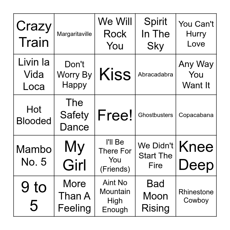 This bingo card has a free space and 71 words: December, 1963 (Oh What a Night), Margaritaville, Sweet Caroline, September, Aint No Mountain High Enough, I Want You Back, Spirit In The Sky, Two Princes, Abracadabra, Build Me Up Buttercup, 9 to 5, Wake Me Up Before You Go-Go, Any Way You Want It, Crazy Train, Escape (Pina Colada Song), Hot Blooded, We Didn't Start The Fire, You Can't Hurry Love, Africa, Copacabana, My Girl, Rhinestone Cowboy, Knee Deep, Hotel California, Hungry Like The Wolf, Total Eclipse of the Heart, Uptown Girl, American Pie, Free Fallin, Come On Eileen, More Than A Feeling, Kokomo, I'm Gonna Be (500 Miles), Tiny Dancer, Bad Moon Rising, Party in The USA, Mamma Mia, Man! I Feel Like A Women, Livin la Vida Loca, Girls Just Want to Have Fun, I'll Be There For You (Friends), Y.M.C.A, Mambo No. 5, We Built This City, Banana Boat( Day-O), Islands in the Sun, Danger Zone, Don't Worry By Happy, Down Under, Dr. Beat, Eye Of The Tiger, Funkytown, Ghostbusters, I Wanna Dance with Somebody, I'm So Excited, It's Raining Men, Kiss, La Bamba, Smooth Criminal, Stand By Me, Sweet Dreams (Are Made of This), The Final Countdown, The Safety Dance, Walking On Sunshine, Whip It, Take Me Home, Country Road, We Will Rock You, My Sharona, Ain't No Sunshine, We are the Champions and Surfin' USA.