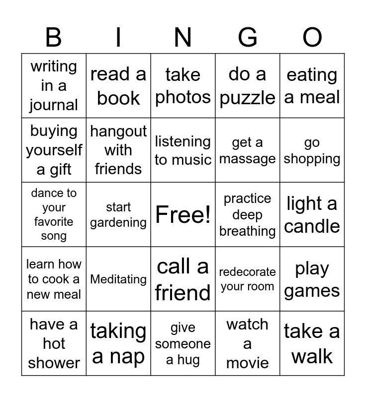 This bingo card has a free space and 24 words: Meditating, taking a nap, listening to music, have a hot shower, eating a meal, writing in a journal, buying yourself a gift, read a book, practice deep breathing, call a friend, get a massage, dance to your favorite song, redecorate your room, play games, hangout with friends, watch a movie, light a candle, take photos, go shopping, start gardening, take a walk, learn how to cook a new meal, do a puzzle and give someone a hug.
