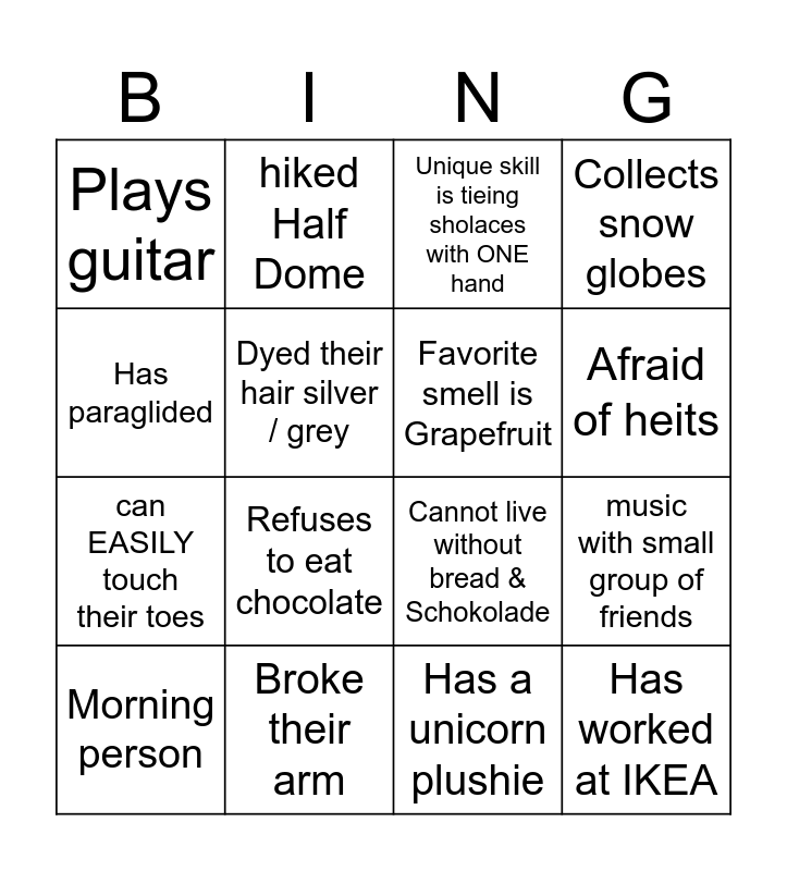 This bingo card has 16 words: Broke their arm, music with small group of friends, Unique skill is tieing sholaces with ONE hand, Plays guitar, can EASILY touch their toes, hiked Half Dome, Cannot live without bread & Schokolade, Has a unicorn plushie, Has paraglided, Dyed their hair silver / grey, Morning person, Collects snow globes, Refuses to eat chocolate, Afraid of heits, Favorite smell is Grapefruit and Has worked at IKEA.