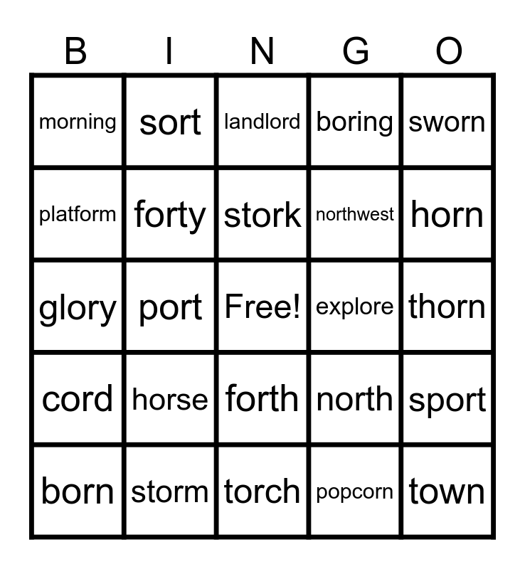 This bingo card has a free space and 30 words: storm, scorch, port, scorn, morning, landlord, forty, forth, explore, torch, thorn, town, popcorn, porch, horn, worn, north, cord, horse, sworn, glory, chore, sort, northwest, platform, boring, sport, born, stork and transport.