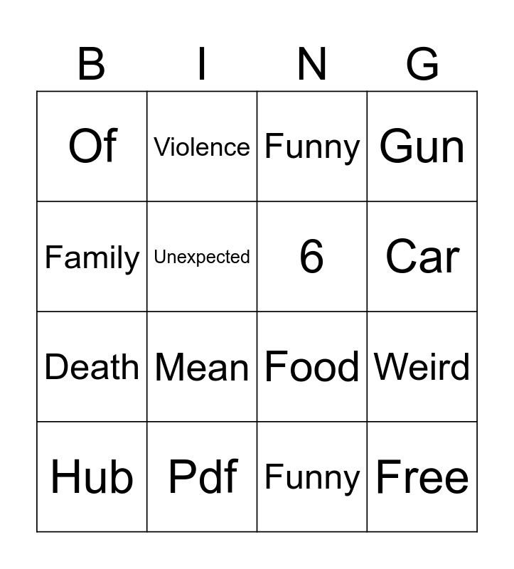 This bingo card has 16 words: Pdf, Weird, Funny, Of, Death, Violence, Food, Funny, Family, Unexpected, Hub, Gun, Mean, Car, 6 and Free.