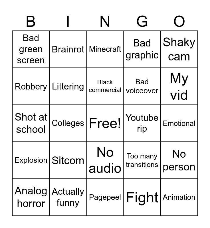 This bingo card has a free space and 24 words: Sitcom, Actually funny, Black commercial, Analog horror, Shaky cam, Bad green screen, Robbery, Brainrot, Youtube rip, No audio, Bad voiceover, Shot at school, Too many transitions, No person, Littering, Fight, Emotional, Minecraft, My vid, Colleges, Animation, Explosion, Bad graphic and Pagepeel.