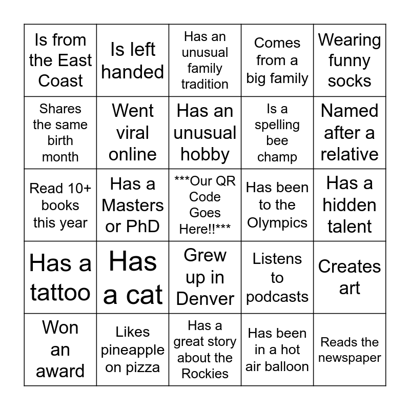 This bingo card has a free space and 24 words: Has a cat, Likes pineapple on pizza, Has an unusual hobby, Won an award, Wearing funny socks, Is from the East Coast, Shares the same birth month, Is left handed, Has been to the Olympics, Grew up in Denver, Is a spelling bee champ, Read 10+ books this year, Listens to podcasts, Creates art, Went viral online, Has been in a hot air balloon, Has a hidden talent, Has an unusual family tradition, Named after a relative, Has a Masters or PhD, Reads the newspaper, Has a tattoo, Comes from a big family and Has a great story about the Rockies.