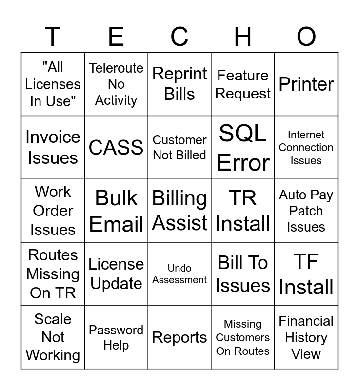 This bingo card has a free space and 24 words: License Update, Password Help, Customer Not Billed, Scale Not Working, Printer, "All Licenses In Use", Invoice Issues, Teleroute No Activity, TR Install, Undo Assessment, SQL Error, Work Order Issues, Bill To Issues, TF Install, CASS, Missing Customers On Routes, Auto Pay Patch Issues, Reprint Bills, Internet Connection Issues, Bulk Email, Financial History View, Routes Missing On TR, Feature Request and Reports.