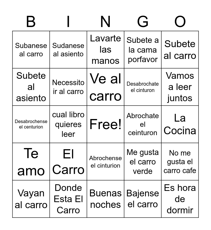 This bingo card has a free space and 24 words: El Carro, Donde Esta El Carro, Ve al carro, Vayan al carro, Subete al carro, Subanese al carro, Subete al asiento, Sudanese al asiento, Abrochate el ceinturon, Abrochense el cinturion, Desabrochate el cinturon, Desabrochense el centurion, Me gusta el carro verde, No me gusta el carro cafe, Necessito ir al carro, Bajense el carro, La Cocina, Lavarte las manos, Vamos a leer juntos, cual libro quieres leer, Es hora de dormir, Te amo, Subete a la cama porfavor and Buenas noches.