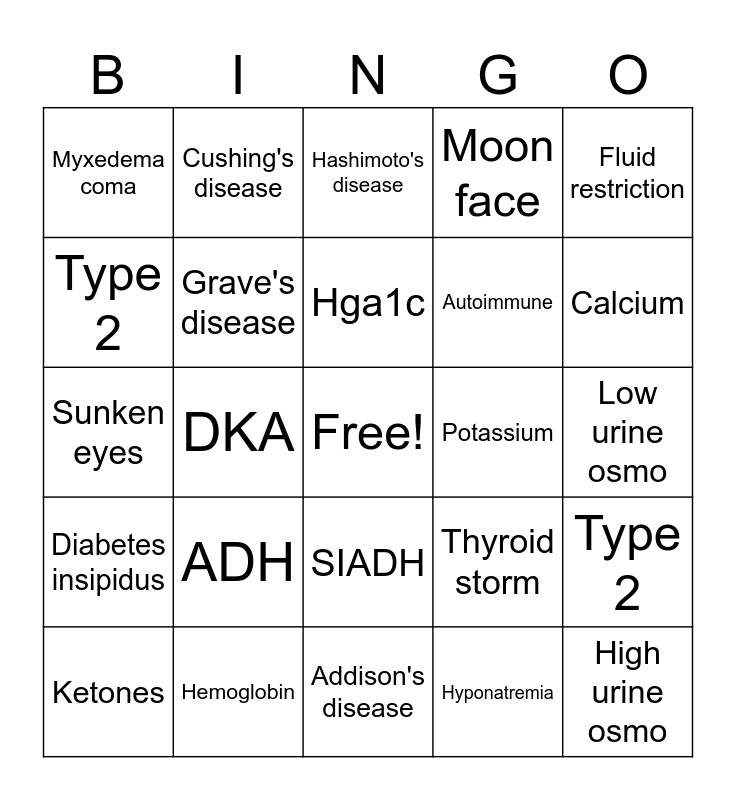 This bingo card has a free space and 31 words: Addison's disease, Cushing's disease, DKA, HHS, Myxedema coma, Hashimoto's disease, Grave's disease, Thyroid storm, Potassium, Hyponatremia, Low urine osmo, High urine osmo, Addisonian crisis, Cushings syndrome, Calcium, Type 1, Type 2, ADH, Diabetes insipidus, SIADH, Fluid restriction, Sodium, Ketones, Cushing's disease, Autoimmune, Type 2, Moon face, Sunken eyes, Hemoglobin, Hga1c and Phosphorus.