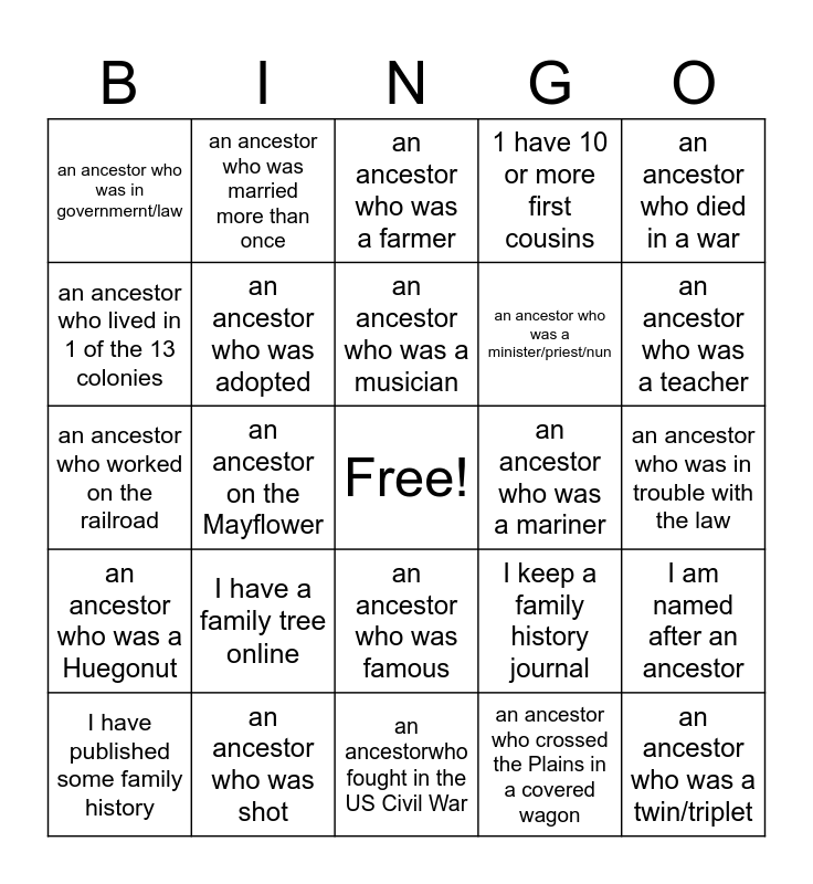This bingo card has a free space and 24 words: I have a family tree online, an ancestor who was shot, an ancestor who was a musician, I have published some family history, an ancestor who died in a war, an ancestor who was in governmernt/law, an ancestor who lived in 1 of the 13 colonies, an ancestor who was married more than once, an ancestor who was a mariner, an ancestor who was famous, an ancestor who was a minister/priest/nun, an ancestor who worked on the railroad, I keep a family history journal, I am named after an ancestor, an ancestor who was adopted, an ancestor who crossed the Plains in a covered wagon, an ancestor who was in trouble with the law, an ancestor who was a farmer, an ancestor who was a teacher, an ancestor on the Mayflower, an ancestor who was a twin/triplet, an ancestor who was a Huegonut, 1 have 10 or more first cousins and an ancestorwho fought in the US Civil War.