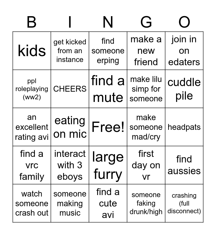 This bingo card has a free space and 24 words: interact with 3 eboys, someone making music, find a mute, watch someone crash out, join in on edaters, kids, ppl roleplaying (ww2), get kicked from an instance, make someone mad/cry, large furry, make lilu simp for someone, an excellent rating avi, first day on vr, find aussies, CHEERS, someone faking drunk/high, headpats, find someone erping, cuddle pile, eating on mic, crashing (full disconnect), find a vrc family, make a new friend and find a cute avi.