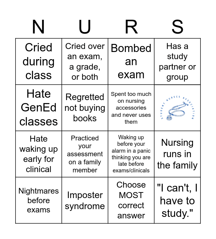 This bingo card has 1 images and 63 words: Thought about switching my major, Slept through class, Always wanted to be a nurse, Went to Mexican after class, Interested in Pediatrics, Pulled an all nighter, Cried over an exam, a grade, or both, Work as a CNA, PCT, or EMT, Failed an exam, Cried in front of a professor, Member of SNA, Choose MOST correct answer, Hate GenEd classes, Not getting enough sleep, Regretted not buying books, Nursing runs in the family, Cried during class, Want to work in a hospital, Hate waking up early for clinical, Hate "Select all that apply." questions, "I can't, I have to study.", Has a study partner or group, Coffee is your best friend, Procrastinate assignments, Said “this is common sense” to justify not studying, Woke up at 3am to study before exam, Bought something that says “RN”, Doesn’t want to do bedside, Came to class sick, Used a study room, At least one class has been interrupted for someone to tell personal story, Have diagnosed yourself with disease you’re learning about, Signed up for something because it’ll look good for the résumé, Practiced your assessment on a family member, Wants to be a psyc nurse, Wants to be a critical care nurse, Wants to be an ED nurse, Has unhealthy coping mechanisms, Spent too much on nursing accessories and never uses them, Waking up before your alarm in a panic thinking you are late before exams/clinicals, Imposter syndrome, Lippincott VS ATI, Knows ADPIE, Attends study lab, Nightmares before exams, Knows all the kahoot answers, Struggles with medicine names, Energy drink lovers, Owns Stanley tumbler, Love clinical but dreads the report, Friends & family seek consultation, Loves asking questions, Wants to be Peds nurse, Undecided, Front benchers, Bombed an exam, Stickers on laptop, Works as CNA, PCT or EMT, Choose the MOST correct answer, Pulled an all nighter, Not getting enough sleep, Owner of multiple sets of scrubs and TEAS vs NCLEX.