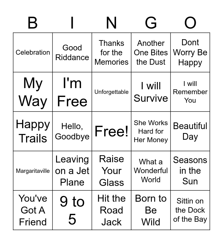 This bingo card has a free space and 29 words: You've Got A Friend, I Hope You Dance, Hello, Goodbye, Oh, What a Beautiful Morning, Celebration, Thanks for the Memories, I'm Free, Leaving on a Jet Plane, She Works Hard for Her Money, 9 to 5, Beautiful Day, Sittin on the Dock of the Bay, Hit the Road Jack, Born to Be Wild, I will Remember You, Manic Monday, Raise Your Glass, Margaritaville, Dont Worry Be Happy, Happy Trails, What a Wonderful World, Take This Job and Shove It, I will Survive, My Way, Another One Bites the Dust, Good Riddance, Seasons in the Sun, Unforgettable and We'll Meet Again.