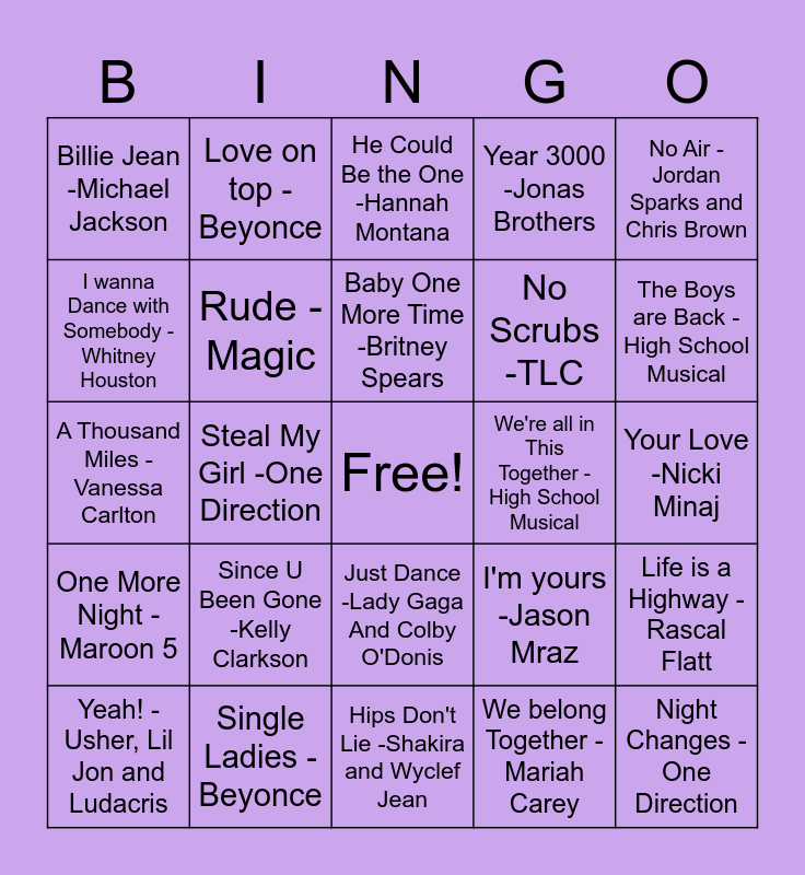 This bingo card has a free space and 24 words: Since U Been Gone -Kelly Clarkson, Single Ladies -Beyonce, Baby One More Time -Britney Spears, Yeah! -Usher, Lil Jon and Ludacris, No Air -Jordan Sparks and Chris Brown, Billie Jean -Michael Jackson, I wanna Dance with Somebody -Whitney Houston, Love on top -Beyonce, We're all in This Together -High School Musical, Just Dance -Lady Gaga And Colby O'Donis, No Scrubs -TLC, A Thousand Miles -Vanessa Carlton, I'm yours -Jason Mraz, Life is a Highway -Rascal Flatt, Rude -Magic, We belong Together -Mariah Carey, Your Love -Nicki Minaj, He Could Be the One -Hannah Montana, The Boys are Back -High School Musical, Steal My Girl -One Direction, Night Changes -One Direction, One More Night - Maroon 5, Year 3000 -Jonas Brothers and Hips Don't Lie -Shakira and Wyclef Jean.