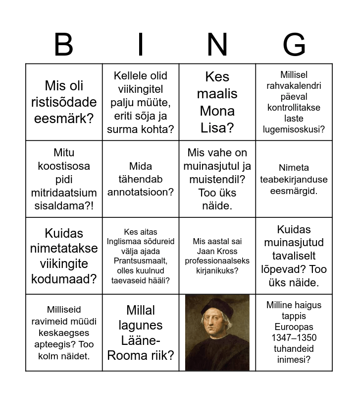 This bingo card has 1 images and 15 words: Millal lagunes Lääne-Rooma riik?, Kuidas muinasjutud tavaliselt lõpevad? Too üks näide., Kes maalis Mona Lisa?, Mis oli ristisõdade eesmärk?, Kuidas nimetatakse viikingite kodumaad?, Kellele olid viikingitel palju müüte, eriti sõja ja surma kohta?, Mis aastal sai Jaan Kross professionaalseks kirjanikuks?, Mitu koostisosa pidi mitridaatsium sisaldama?!, Mida tähendab annotatsioon?, Milliseid ravimeid müüdi keskaegses apteegis? Too kolm näidet., Millisel rahvakalendri päeval kontrollitakse laste lugemisoskusi?, Kes aitas Inglismaa sõdureid välja ajada Prantsusmaalt, olles kuulnud taevaseid hääli?, Nimeta teabekirjanduse eesmärgid., Mis vahe on muinasjutul ja muistendil? Too üks näide. and Milline haigus tappis Euroopas 1347–1350 tuhandeid inimesi?.