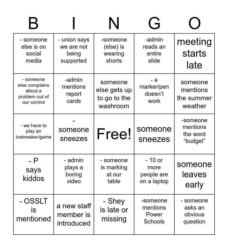 This bingo card has a free space and 24 words: - admin plays a boring video, a new staff member is introduced, someone else gets up to go to the washroom, - OSSLT is mentioned, meeting starts late, - someone else is on social media, - someone else complains about a problem out of our control, - union says we are not being supported, someone sneezes, - someone is marking at our table, - a marker/pen doesn’t work, - we have to play an icebreaker/game, - 10 or more people are on a laptop, someone leaves early, -admin mentions report cards, -someone mentions Power Schools, -someone mentions the word “budget”, -someone (else) is wearing shorts, someone mentions the summer weather, - someone sneezes, - someone asks an obvious question, - P says kiddos, -admin reads an entire slide and - Shey is late or missing.