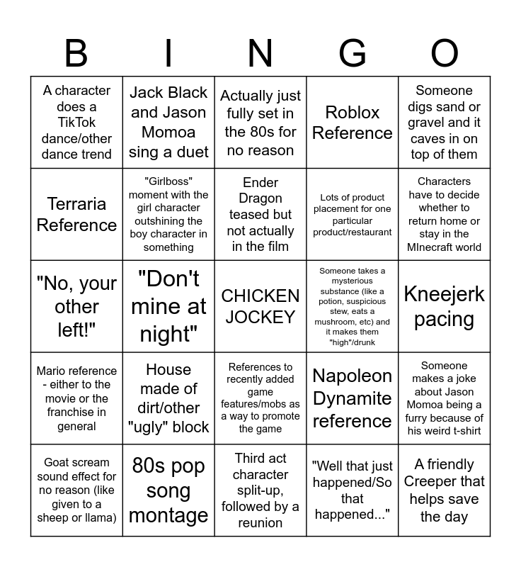 This bingo card has a free space and 30 words: 80s pop song montage, Fart joke, "Don't mine at night", "He's right behind me, isn't he?", A character does a TikTok dance/other dance trend, Actually just fully set in the 80s for no reason, "Girlboss" moment with the girl character outshining the boy character in something, References to recently added game features/mobs as a way to promote the game, Someone takes a mysterious substance (like a potion, suspicious stew, eats a mushroom, etc) and it makes them "high"/drunk, Third act character split-up, followed by a reunion, Kneejerk pacing, A friendly Creeper that helps save the day, "Well that just happened/So that happened...", Homoerotic moment between Jack Black and Jason Momoa, Characters have to decide whether to return home or stay in the MInecraft world, "Meta" joke where they realize they're in a video game, Napoleon Dynamite reference, Mario reference - either to the movie or the franchise in general, House made of dirt/other "ugly" block, Someone digs sand or gravel and it caves in on top of them, "No, your other left!", A normally cute/peaceful mob character turns out to be violent and attacks the main characters, Jack Black and Jason Momoa sing a duet, Lots of product placement for one particular product/restaurant, Terraria Reference, Roblox Reference, Someone makes a joke about Jason Momoa being a furry because of his weird t-shirt, Goat scream sound effect for no reason (like given to a sheep or llama), Ender Dragon teased but not actually in the film and Herobrine tease/cameo.