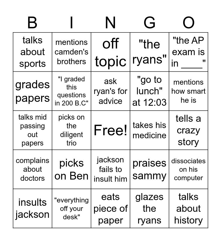 This bingo card has a free space and 24 words: picks on Ben, "everything off your desk", ask ryan's for advice, insults jackson, "the AP exam is in ____", talks about sports, grades papers, mentions camden's brothers, takes his medicine, jackson fails to insult him, "go to lunch" at 12:03, talks mid passing out papers, praises sammy, dissociates on his computer, "I graded this questions in 200 B.C", glazes the ryans, tells a crazy story, off topic, mentions how smart he is, picks on the diligent trio, talks about history, complains about doctors, "the ryans" and eats piece of paper.