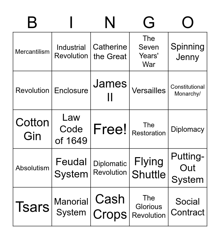 This bingo card has a free space and 24 words: Feudal System, Manorial System, James II, Tsars, Spinning Jenny, Mercantilism, Revolution, Industrial Revolution, The Restoration, Diplomatic Revolution, Versailles, Cotton Gin, Flying Shuttle, Putting-Out System, Enclosure, The Glorious Revolution, Diplomacy, Catherine the Great, Constitutional Monarchy/, Law Code of 1649, Social Contract, Absolutism, The Seven Years' War and Cash Crops.