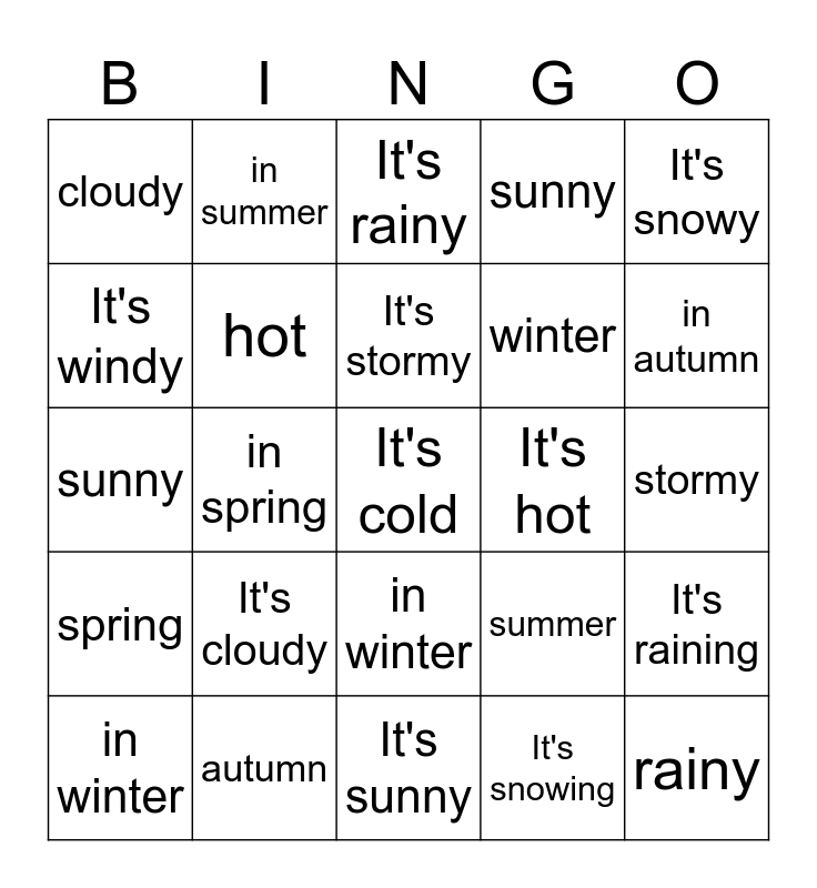 This bingo card has a free space and 24 words: It's cloudy, autumn, It's stormy, in winter, It's snowy, cloudy, It's windy, in summer, It's hot, in winter, winter, sunny, summer, It's raining, hot, It's snowing, stormy, It's rainy, in autumn, in spring, rainy, spring, sunny and It's sunny.