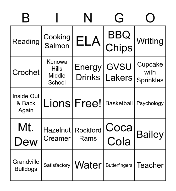 This bingo card has a free space and 25 words: Hazelnut Creamer, Water, Energy Drinks, Grandville Bulldogs, Writing, Reading, Crochet, Cooking Salmon, Basketball, Rockford Rams, GVSU Lakers, Inside Out & Back Again, Coca Cola, Bailey, Kenowa Hills Middle School, Samuel, Psychology, ELA, Cupcake with Sprinkles, Lions, Teacher, Satisfactory, Mt. Dew, BBQ Chips and Butterfingers.
