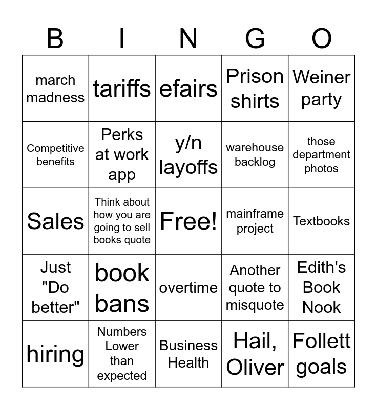 This bingo card has a free space and 24 words: book bans, Numbers Lower than expected, y/n layoffs, hiring, Weiner party, march madness, Competitive benefits, tariffs, mainframe project, overtime, warehouse backlog, Sales, Another quote to misquote, Edith's Book Nook, Perks at work app, Hail, Oliver, Textbooks, efairs, those department photos, Think about how you are going to sell books quote, Follett goals, Just "Do better", Prison shirts and Business Health.