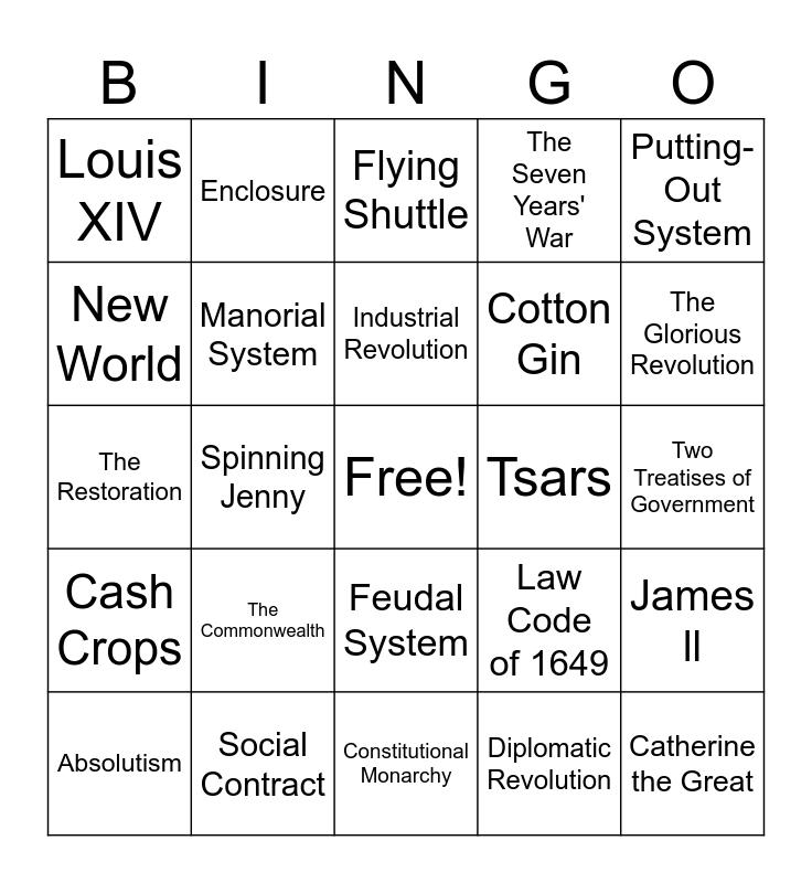 This bingo card has a free space and 24 words: The Commonwealth, Social Contract, Industrial Revolution, Absolutism, Putting-Out System, Louis XIV, New World, Enclosure, Tsars, Feudal System, Cotton Gin, The Restoration, Law Code of 1649, James ll, Manorial System, Diplomatic Revolution, Two Treatises of Government, Flying Shuttle, The Glorious Revolution, Spinning Jenny, Catherine the Great, Cash Crops, The Seven Years' War and Constitutional Monarchy.