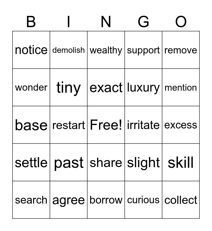 This bingo card has a free space and 30 words: agree, center, restart, doubt, notice, wealthy, tiny, share, irritate, borrow, excess, collect, curious, fair, mention, disappear, slight, settle, past, remove, base, connect, demolish, luxury, wonder, support, skill, search, exact and unite.