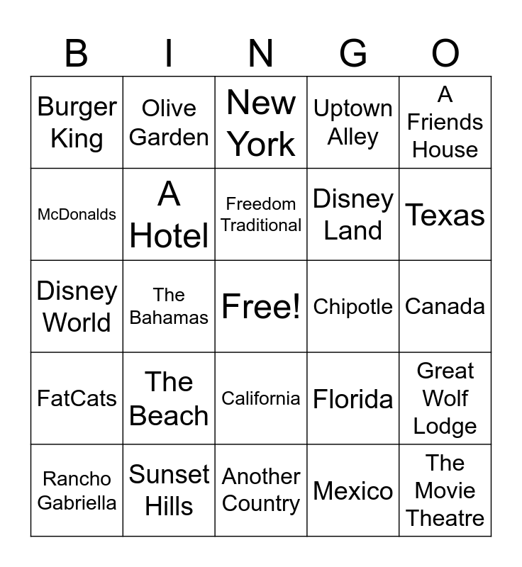 This bingo card has a free space and 24 words: The Beach, Sunset Hills, Freedom Traditional, Rancho Gabriella, A Friends House, Burger King, McDonalds, Olive Garden, Chipotle, California, Disney Land, Disney World, Florida, Great Wolf Lodge, A Hotel, Mexico, Canada, New York, Texas, The Bahamas, The Movie Theatre, FatCats, Uptown Alley and Another Country.