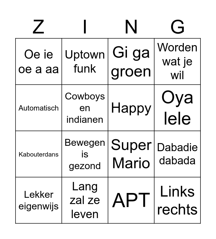 This bingo card has 39 words: Free!, Baila bailalaa, Macarena, Happy, Europapa, Mango mango, Oya lele, Laat het los, Automatisch, Links rechts, Dabadie dabada, Worden wat je wil, Lekker eigenwijs, APT, Lang zal ze leven, Waka waka, De pinguïndans, Oe ie oe a aa, Het vliegerlied, Toeter op mijn waterscooter, Cowboys en indianen, Dans met tante Rita, Kabouterdans, Bewegen is gezond, 10.000 luchtballonnen, Luchtballon, Waterval, Shake it off, Savage love, Uptown funk, All i want for Christmas is you, C’est la vie, Gi ga groen, Cruel summer, Heya mama, Dance monkey, I’m blue, Super Mario and Can’t stop the feeling.