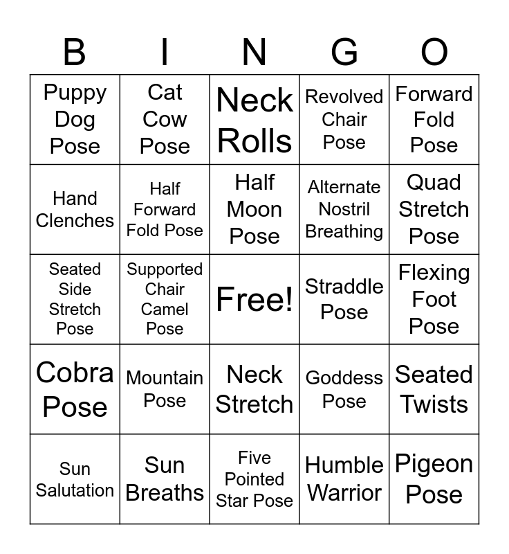 This bingo card has a free space and 24 words: Mountain Pose, Sun Breaths, Half Moon Pose, Sun Salutation, Forward Fold Pose, Puppy Dog Pose, Hand Clenches, Cat Cow Pose, Straddle Pose, Neck Stretch, Alternate Nostril Breathing, Seated Side Stretch Pose, Goddess Pose, Seated Twists, Half Forward Fold Pose, Humble Warrior, Flexing Foot Pose, Neck Rolls, Quad Stretch Pose, Supported Chair Camel Pose, Pigeon Pose, Cobra Pose, Revolved Chair Pose and Five Pointed Star Pose.