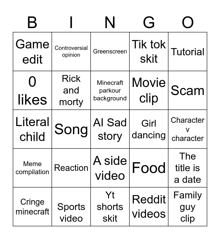 This bingo card has a free space and 24 words: Reaction, Sports video, Minecraft parkour background, Cringe minecraft, Tutorial, Game edit, 0 likes, Controversial opinion, Girl dancing, A side video, Movie clip, Literal child, Food, The title is a date, Rick and morty, Reddit videos, Character v character, Greenscreen, Scam, Song, Family guy clip, Meme compilation, Tik tok skit and Yt shorts skit.
