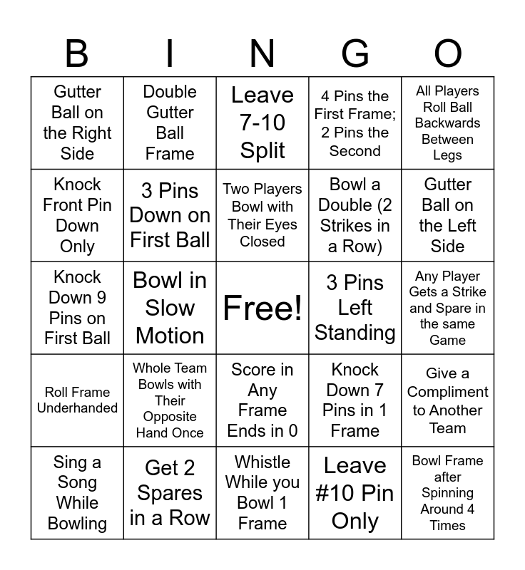 This bingo card has a free space and 24 words: Whole Team Bowls with Their Opposite Hand Once, Get 2 Spares in a Row, Two Players Bowl with Their Eyes Closed, Sing a Song While Bowling, All Players Roll Ball Backwards Between Legs, Gutter Ball on the Right Side, Knock Front Pin Down Only, Double Gutter Ball Frame, 3 Pins Left Standing, Score in Any Frame Ends in 0, Bowl a Double (2 Strikes in a Row), Knock Down 9 Pins on First Ball, Knock Down 7 Pins in 1 Frame, Give a Compliment to Another Team, 3 Pins Down on First Ball, Leave #10 Pin Only, Any Player Gets a Strike and Spare in the same Game, Leave 7-10 Split, Gutter Ball on the Left Side, Bowl in Slow Motion, Bowl Frame after Spinning Around 4 Times, Roll Frame Underhanded, 4 Pins the First Frame; 2 Pins the Second and Whistle While you Bowl 1 Frame.