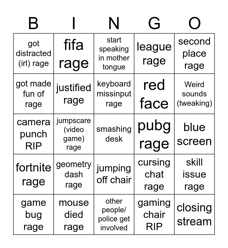 This bingo card has a free space and 24 words: geometry dash rage, mouse died rage, keyboard missinput rage, game bug rage, second place rage, got distracted (irl) rage, got made fun of rage, fifa rage, pubg rage, jumping off chair, red face, camera punch RIP, cursing chat rage, skill issue rage, justified rage, gaming chair RIP, blue screen, start speaking in mother tongue, Weird sounds (tweaking), jumpscare (video game) rage, closing stream, fortnite rage, league rage and other people/ police get involved.