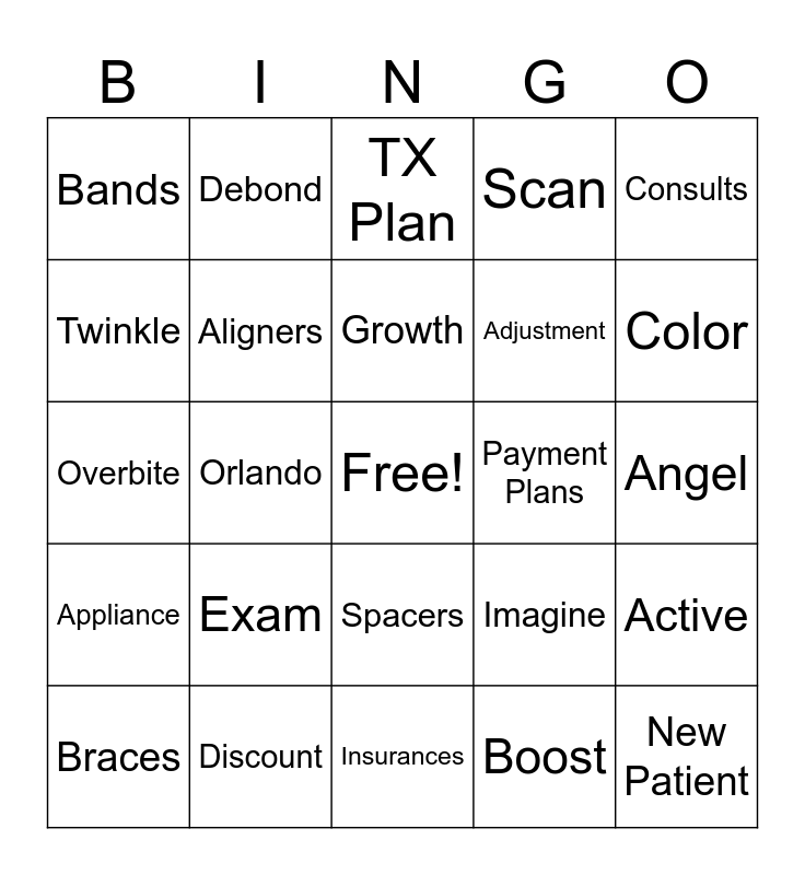 This bingo card has a free space and 29 words: Braces, Lion, Orlando, Brackets, Bands, TX Plan, Aligners, Exam, Payment Plans, Discount, Angel, New Patient, Insurances, Boost, Color, Wire, Spacers, Appliance, Consults, Overbite, Imagine, Retainer, Adjustment, Twinkle, Scan, Debond, Active, Growth and Specialist.
