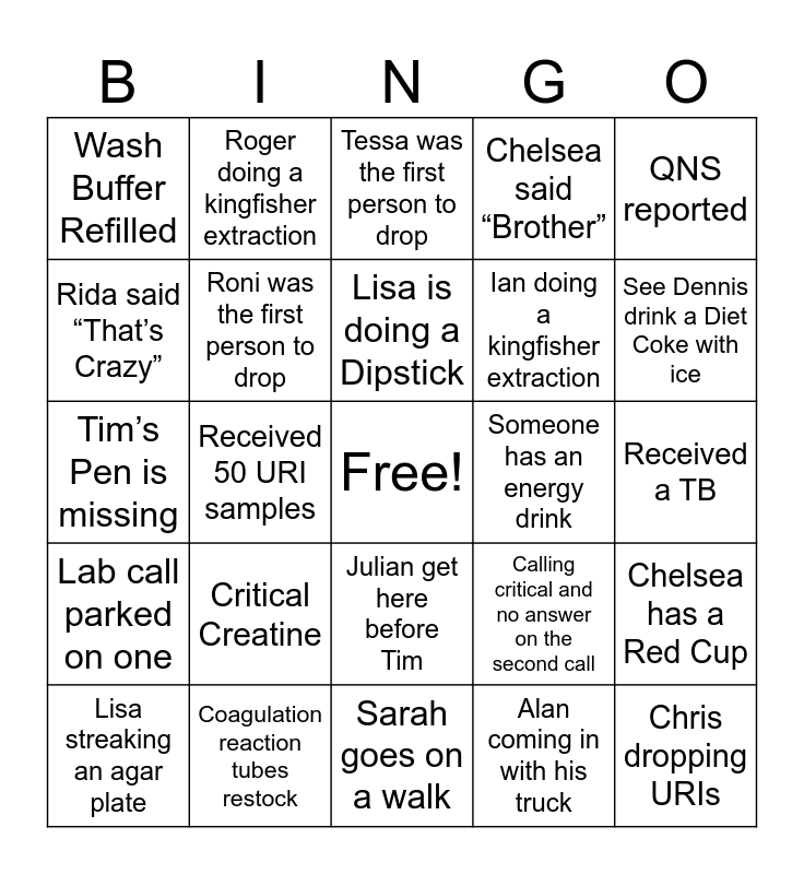 This bingo card has a free space and 30 words: Coagulation reaction tubes restock, CBC barcode reader stuck, Received 50 URI samples, Received 20 Urine sample for PCR, Wash Buffer Refilled, Tessa was the first person to drop, Roni was the first person to drop, Julian get here before Tim, Someone has an energy drink, Sarah goes on a walk, Received a TB, Chris dropping URIs, Alan coming in with his truck, Dennis coming into the Lab, See Dennis drink a Diet Coke with ice, Calling critical and no one answering, Calling critical and no answer on the second call, Lab call parked on one, Critical Creatine, QNS reported, Tim’s Pen is missing, Sarah doing a kingfisher extraction, Roger doing a kingfisher extraction, Ian doing a kingfisher extraction, Rida said “That’s Crazy”, Chelsea said “Brother”, Chelsea has a Red Cup, Lisa streaking an agar plate, Lisa is doing a Dipstick and Someone on the intercom "Alan you have a phone call".