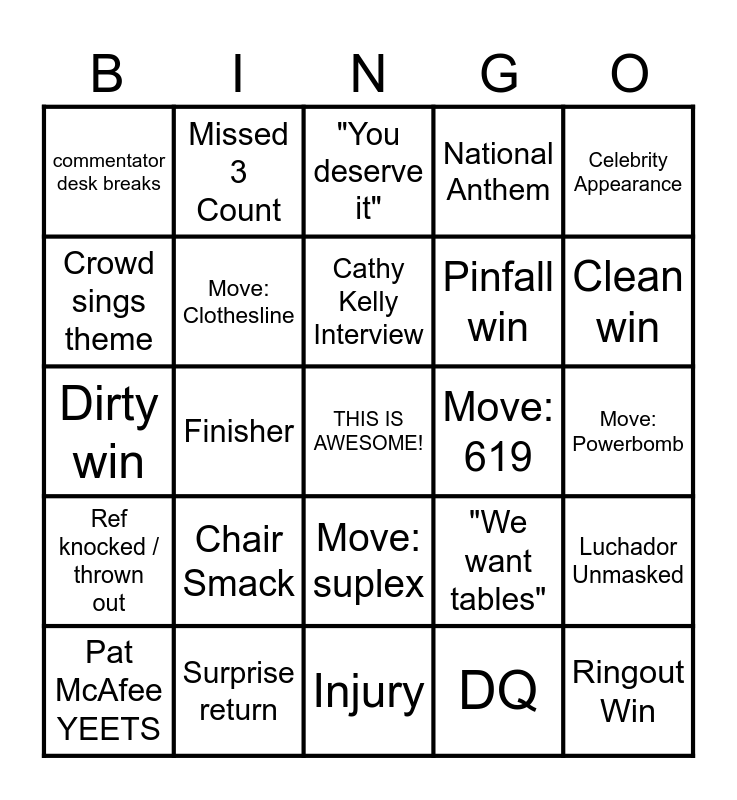 This bingo card has a free space and 24 words: Chair Smack, Surprise return, Cathy Kelly Interview, Pat McAfee YEETS, Celebrity Appearance, commentator desk breaks, Crowd sings theme, Missed 3 Count, Move: 619, Move: suplex, Pinfall win, Dirty win, "We want tables", Luchador Unmasked, Move: Clothesline, DQ, Move: Powerbomb, "You deserve it", Clean win, Finisher, Ringout Win, Ref knocked / thrown out, National Anthem and Injury.