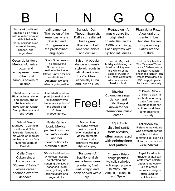 This bingo card has a free space and 24 words: Frida Kahlo - Iconic Mexican painter known for her self-portraits and her contributions to Mexican culture., Día de los Muertos - A Mexican holiday celebrating and honoring the lives of deceased loved ones, typically with colorful altars and sugar skulls., Salsa - A popular dance and music style with roots in Latin America and the Caribbean, especially Cuba and Puerto Rico., Celia Cruz - Cuban singer known as the "Queen of Salsa," whose career spanned over five decades., Plaza de la Raza - A cultural arts center in Los Angeles, known for promoting Latinx art and culture., Tacos - A traditional Mexican dish made with a folded or rolled tortilla filled with various fillings such as meat, beans, cheese, and vegetables., Oscar de la Hoya - Mexican-American boxer and entrepreneur, one of the most famous boxers of all time., Latinoamérica - The region of the Americas where Spanish and Portuguese are the predominant languages., Shakira - Colombian singer, dancer, and philanthropist known for her international music career., Mariachi - A traditional Mexican music ensemble, often consisting of violins, trumpets, guitars, and a distinctive Mexican style of singing., Cinco de Mayo - A holiday celebrating the Mexican victory over the French at the Battle of Puebla in 1862, often celebrated with parades and Mexican food., Rita Moreno - Puerto Rican actress, singer, and dancer, one of the few artists to have won an Oscar, Emmy, Grammy, and Tony Award., Tequila - A distilled spirit from Mexico, often associated with celebrations and parties., Latinx Activists - Refers to individuals who advocate for the rights of Latinx communities, such as Dolores Huerta and César Chávez., Sonia Sotomayor - The first Latina Supreme Court Justice in the United States, known for her contributions to American law and advocacy for justice., Churros - Fried-dough pastries, typically sprinkled with sugar, popular in many Latin American countries and Spain., El Día del Niño - "Children’s Day," a celebration in many Latin American countries to honor children and their contributions to society., Salvador Dalí - Though Spanish, Dalí’s surrealist art had a great influence on Latin American artists and culture., Selena Quintanilla - The "Queen of Tejano music," Selena was a Mexican-American singer and fashion icon whose tragic death in 1995 deeply impacted the Latinx community., José Martí - Cuban poet, journalist, and revolutionary who became a symbol of the struggle for Cuban independence., Papel Picado - A traditional Mexican craft where colorful paper is intricately cut to create decorative designs, often used for celebrations., Gabriel García Márquez - Colombian writer and Nobel laureate, famous for his works on magical realism, such as One Hundred Years of Solitude., Reggaeton - A music genre that originated in Puerto Rico in the 1990s, combining Latin rhythms with hip hop influences. and Tostones - A traditional dish made from green plantains, fried until crispy, and often served with a dip..
