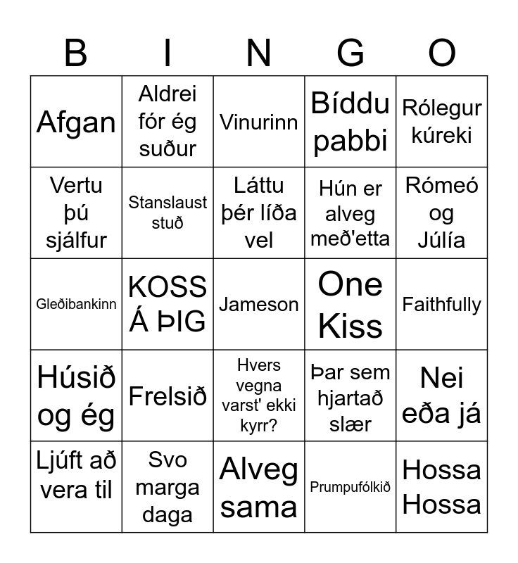 This bingo card has 202 words: Track Name, Gemmér Gemmér, Krumla, Sexy Ru, Rúlletta, Elli Egils, KOSS Á ÞIG, Í síðasta skipti, Fröken Reykjavík, Hún er alveg með'etta, RÓA, Mávar, Free!, Bíómynd, Einn dans við mig, Þorparinn, Prins Póló, Rabbarbara Rúna, Cheri Cheri Lady, Álfar, Afgan, Serbinn, Gull, Ég stend á skýi, Svo marga daga, Rasputin, Ástarbréf merkt X, Cha Cha Cha, Þar sem hjartað slær, Ég er á leiðinni, Hvers vegna varst' ekki kyrr?, Ljúft að vera til, Ég fer í fríið, Mamma þarf að djamma, Hossa Hossa, Draumur um Nínu, Sódóma, Coming Home, Spenntur, Rangur maður, Manstu ekki eftir mér, Rómeó og Júlía, Í larí lei, Horfðu til himins, Nei eða já, Vertu ekki að plata mig, Too Late, Álfheiður Björk, Hjálpaðu mér upp, Sísí, Rólegur kúreki, Bíddu pabbi, Gleðibankinn, Húsið og ég, Lagið um það sem er bannað, Prumpufólkið, París Norðursins, Sódóma, Hvítir Skór, Eitt lag enn, Furðuverk, I'm Still Standing, Rocket Man, Don't Go Breaking My Heart, Your Song, Goodbye Yellow Brick Road, Lífið er yndislegt, Hvar er draumurinn?, Hjá þér, Vinurinn, Undir þínum áhrifum, Gestalistinn, Vertu þú sjálfur, Rhythm Is a Dancer, Dancing Lasha Tumbai, Bent nálgast, Alveg sama, One Kiss, Allt fyrir ástina, Ho, Ho, Ho We Say Hey, Hey, Hey, Afgan, Hotel California, Scatman, Betri tíð, Myndir, Láttu þér líða vel, Jameson, Farin, Señorita, Grenja, Það bera sig allir vel, Gefðu allt sem þú átt, Ég fer á Land Rover frá Mývatni á Kópasker, Stanslaust stuð, Aldrei fór ég suður, Frelsið, Útihátíð, Krókurinn, Separate Ways, Don't Stop Believin', Any Way You Want It, Faithfully, Gemmér Gemmér, Krumla, Sexy Ru, Rúlletta, Elli Egils, KOSS Á ÞIG, Í síðasta skipti, Fröken Reykjavík, Hún er alveg með'etta, RÓA, Mávar, Bíómynd, Einn dans við mig, Þorparinn, Prins Póló, Rabbarbara Rúna, Cheri Cheri Lady, Álfar, Afgan, Serbinn, Gull, Ég stend á skýi, Svo marga daga, Rasputin, Ástarbréf merkt X, Cha Cha Cha, Þar sem hjartað slær, Ég er á leiðinni, Hvers vegna varst' ekki kyrr?, Ljúft að vera til, Ég fer í fríið, Mamma þarf að djamma, Hossa Hossa, Draumur um Nínu, Sódóma, Coming Home, Spenntur, Rangur maður, Manstu ekki eftir mér, Rómeó og Júlía, Í larí lei, Horfðu til himins, Nei eða já, Vertu ekki að plata mig, Too Late, Álfheiður Björk, Hjálpaðu mér upp, Sísí, Rólegur kúreki, Bíddu pabbi, Gleðibankinn, Húsið og ég, Lagið um það sem er bannað, Prumpufólkið, París Norðursins, Sódóma, Hvítir Skór, Eitt lag enn, Furðuverk, I'm Still Standing, Rocket Man, Don't Go Breaking My Heart, Your Song, Goodbye Yellow Brick Road, Lífið er yndislegt, Hvar er draumurinn?, Hjá þér, Vinurinn, Undir þínum áhrifum, Gestalistinn, Vertu þú sjálfur, Rhythm Is a Dancer, Dancing Lasha Tumbai, Bent nálgast, Alveg sama (Til í allt, Pt. II), One Kiss, Allt fyrir ástina, Ho, Ho, Ho We Say Hey, Hey, Hey, Afgan, Hotel California, Scatman, Betri tíð, Myndir, Láttu þér líða vel, Jameson, Farin, Señorita, Grenja, Það bera sig allir vel, Gefðu allt sem þú átt, Ég fer á Land Rover frá Mývatni á Kópasker, Stanslaust stuð, Aldrei fór ég suður, Frelsið, Útihátíð, Krókurinn, Separate Ways, Don't Stop Believin', Any Way You Want It and Faithfully.