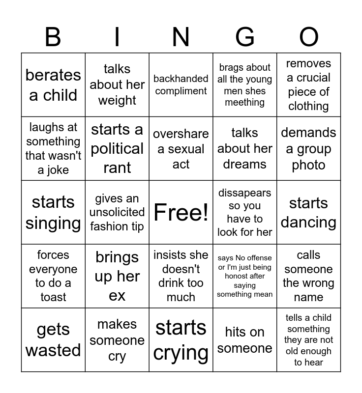 This bingo card has a free space and 24 words: gets wasted, brings up her ex, overshare a sexual act, hits on someone, removes a crucial piece of clothing, berates a child, talks about her weight, backhanded compliment, dissapears so you have to look for her, starts dancing, starts singing, starts a political rant, says No offense or I'm just being honost after saying something mean, calls someone the wrong name, laughs at something that wasn't a joke, makes someone cry, starts crying, brags about all the young men shes meething, demands a group photo, forces everyone to do a toast, gives an unsolicited fashion tip, insists she doesn't drink too much, talks about her dreams and tells a child something they are not old enough to hear.
