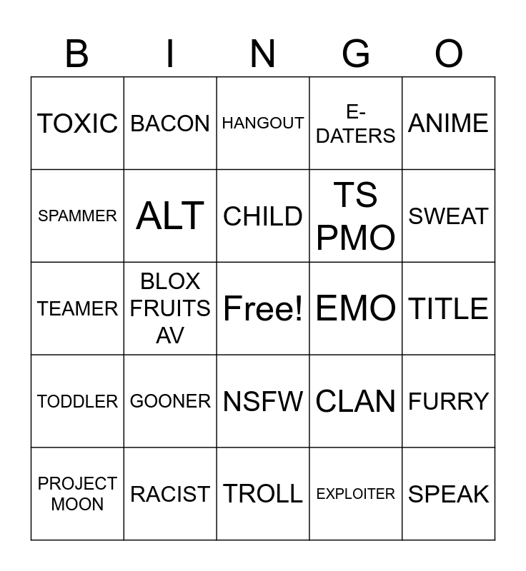 This bingo card has a free space and 24 words: GOONER, RACIST, CHILD, PROJECT MOON, ANIME, TOXIC, SPAMMER, BACON, EMO, NSFW, TS PMO, TEAMER, CLAN, FURRY, ALT, EXPLOITER, TITLE, HANGOUT, SWEAT, BLOX FRUITS AV, SPEAK, TODDLER, E-DATERS and TROLL.