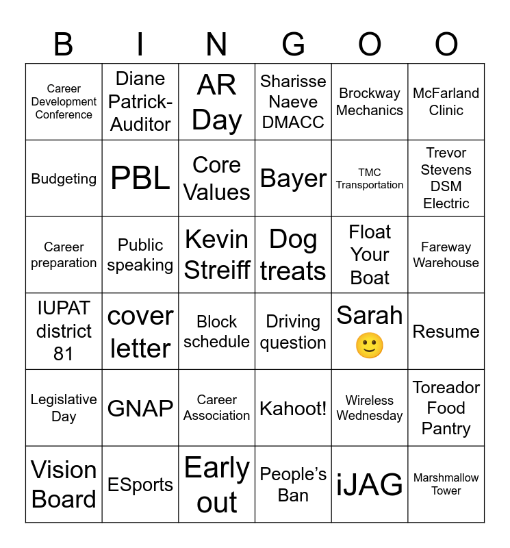 This bingo card has 42 words: iJAG, PBL, Business Plan, Float Your Boat, Resume, cover letter, Career preparation, Employability skills, AR Day, Fareway Warehouse, Kevin Streiff, Bayer, Trevor Stevens DSM Electric, Brockway Mechanics, ESports, IUPAT district 81, Toreador Food Pantry, TMC Transportation, Marshmallow Tower, Diane Patrick- Auditor, McFarland Clinic, Career Association, Legislative Day, Career Development Conference, Float Your Boat, Vision Board, Core Values, Mock Interviews, GNAP, Wireless Wednesday, Leadership style, Dog treats, Budgeting, Sarah 🙂, Early out, Block schedule, Driving question, Public speaking, Kahoot!, People’s Ban, Sharisse Naeve DMACC and Follow up.