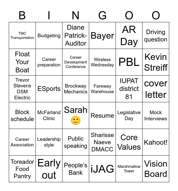 This bingo card has 41 words: iJAG, PBL, Business Plan, Float Your Boat, Resume, cover letter, Career preparation, Employability skills, AR Day, Fareway Warehouse, Kevin Streiff, Bayer, Trevor Stevens DSM Electric, Brockway Mechanics, ESports, IUPAT district 81, Toreador Food Pantry, TMC Transportation, Marshmallow Tower, Diane Patrick- Auditor, McFarland Clinic, Career Association, Legislative Day, Career Development Conference, Vision Board, Core Values, Mock Interviews, GNAP, Wireless Wednesday, Leadership style, Dog treats, Budgeting, Sarah 🙂, Early out, Block schedule, Driving question, Public speaking, Kahoot!, People’s Bank, Sharisse Naeve DMACC and Follow up.