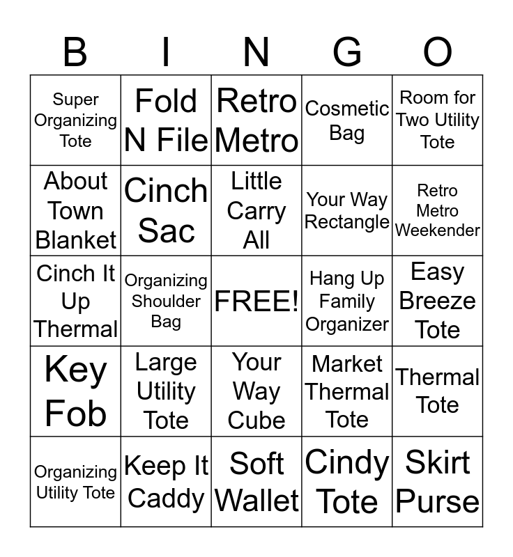 This bingo card has a free space and 24 words: Large Utility Tote, Keep It Caddy, Little Carry All, Organizing Utility Tote, Room for Two Utility Tote, Super Organizing Tote, About Town Blanket, Fold N File, Hang Up Family Organizer, Your Way Cube, Your Way Rectangle, Cinch It Up Thermal, Market Thermal Tote, Thermal Tote, Cinch Sac, Cindy Tote, Easy Breeze Tote, Retro Metro, Retro Metro Weekender, Organizing Shoulder Bag, Skirt Purse, Key Fob, Cosmetic Bag and Soft Wallet.