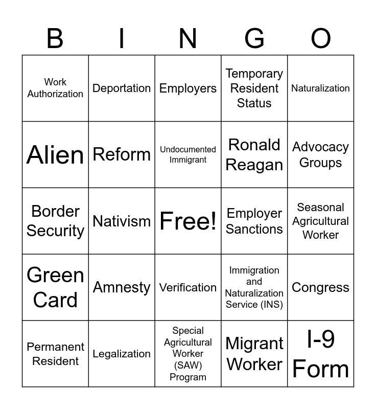 This bingo card has a free space and 24 words: Amnesty, Legalization, Undocumented Immigrant, Permanent Resident, Naturalization, Work Authorization, Alien, Deportation, Employer Sanctions, Verification, Ronald Reagan, Border Security, Immigration and Naturalization Service (INS), Congress, Reform, Migrant Worker, Seasonal Agricultural Worker, Employers, Advocacy Groups, Nativism, I-9 Form, Green Card, Temporary Resident Status and Special Agricultural Worker (SAW) Program.