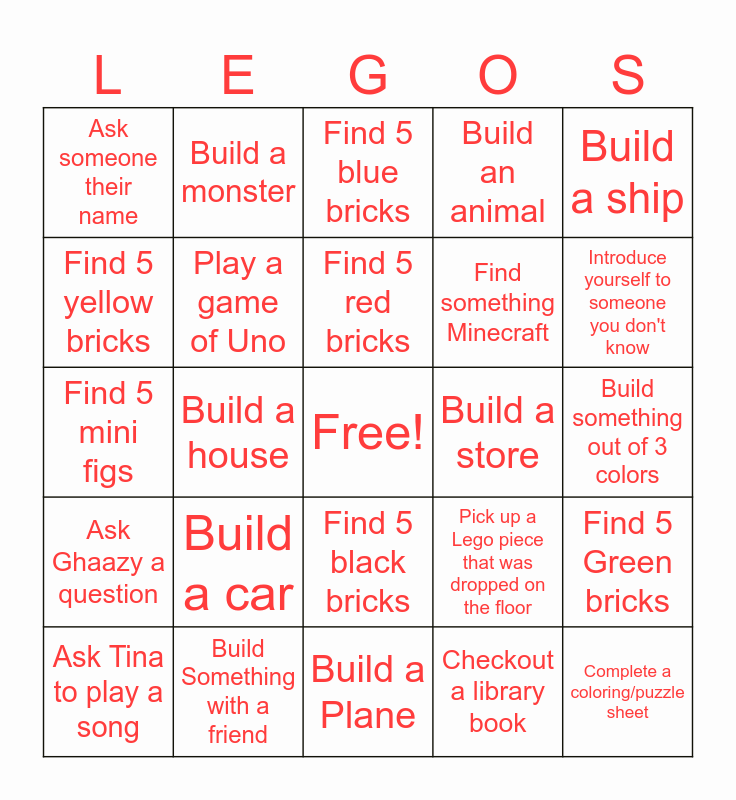This bingo card has a free space and 24 words: Build a car, Build Something with a friend, Find 5 red bricks, Ask Tina to play a song, Build a ship, Ask someone their name, Find 5 yellow bricks, Build a monster, Build a store, Find 5 black bricks, Find something Minecraft, Find 5 mini figs, Pick up a Lego piece that was dropped on the floor, Find 5 Green bricks, Play a game of Uno, Checkout a library book, Build something out of 3 colors, Find 5 blue bricks, Introduce yourself to someone you don't know, Build a house, Complete a coloring/puzzle sheet, Ask Ghaazy a question, Build an animal and Build a Plane.