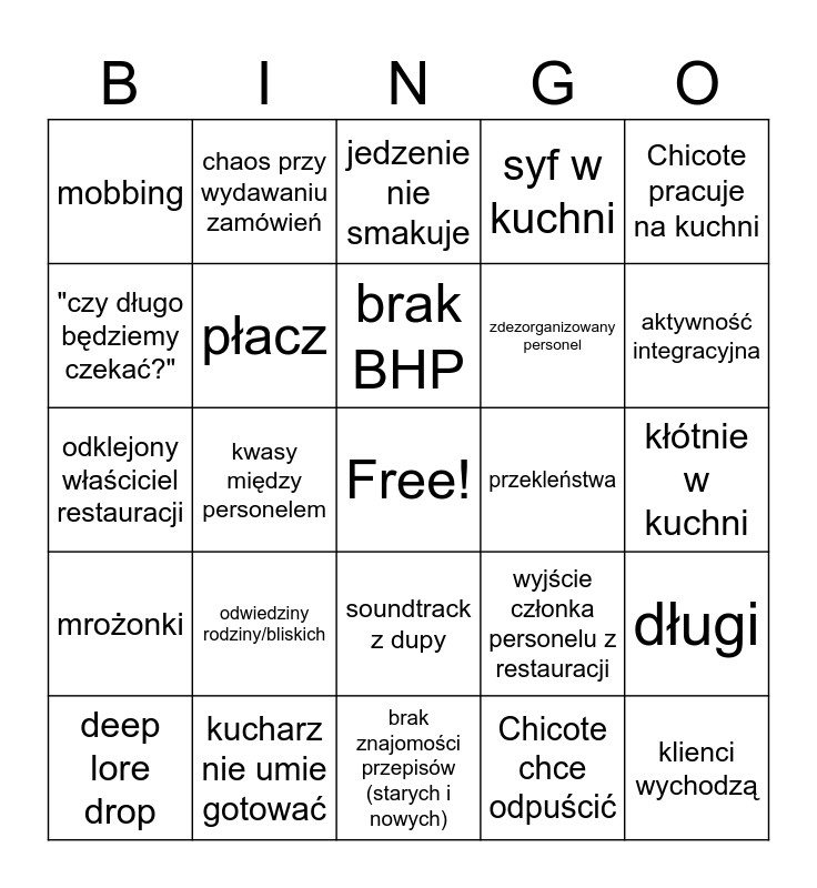 This bingo card has a free space and 24 words: odwiedziny rodziny/bliskich, kucharz nie umie gotować, brak BHP, deep lore drop, Chicote pracuje na kuchni, mobbing, "czy długo będziemy czekać?", chaos przy wydawaniu zamówień, przekleństwa, soundtrack z dupy, zdezorganizowany personel, odklejony właściciel restauracji, wyjście członka personelu z restauracji, długi, płacz, Chicote chce odpuścić, kłótnie w kuchni, jedzenie nie smakuje, aktywność integracyjna, kwasy między personelem, klienci wychodzą, mrożonki, syf w kuchni and brak znajomości przepisów (starych i nowych).