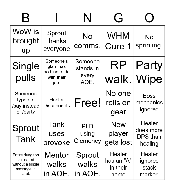This bingo card has a free space and 39 words: DPS Pulls ahead of Tank, Tank forgets stance, Someone doesn't skip cutscene, New player gets lost, Healer does more DPS than healing, Sprout Tank, Healer Disconnects, Instant Queue Pop, No one rolls on gear, Boss mechanics ignored, Single pulls, Sprout thanks everyone, Dungeon ends in silence, Party Wipe, Someone types in /say instead of /party, Tank uses provoke, PLD using Clemency, WHM Cure 1, Controller Player, Entire dungeon is cleared without a single message in chat., Someone’s glam has nothing to do with their job., Someone stands in every AOE., Healer has an "A" in their name, No sprinting., Nobody messes up., Mentor walks in AOE., Sprout walks in AOE., Someone wearing full wedding glam., Elezen. There's an Elezen., WoW is brought up, Lalafell tank., Someone is jumping constantly., RP walk., Healer ignores stack marker., Someone types “gg ez”, No one dies., No comms., brb real quick and Get 3 comms in one dungeon.