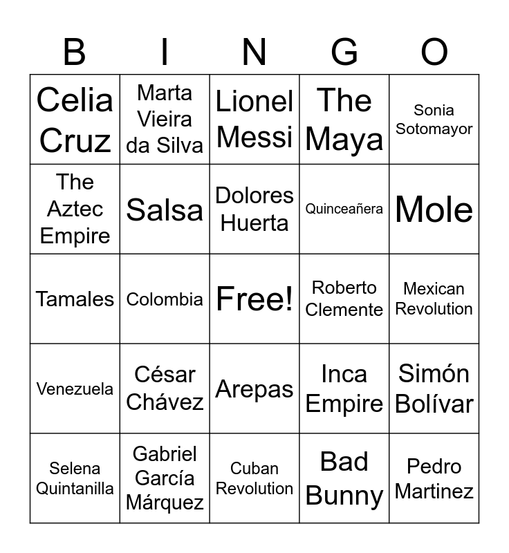 This bingo card has a free space and 24 words: César Chávez, Gabriel García Márquez, Dolores Huerta, Selena Quintanilla, Sonia Sotomayor, Celia Cruz, The Aztec Empire, Marta Vieira da Silva, Roberto Clemente, Arepas, Quinceañera, Tamales, Inca Empire, Simón Bolívar, Salsa, Bad Bunny, Mexican Revolution, Lionel Messi, Mole, Colombia, Pedro Martinez, Venezuela, The Maya and Cuban Revolution.
