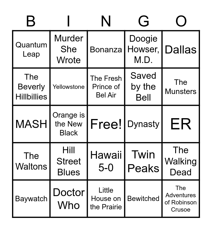 This bingo card has a free space and 44 words: The A-Team, The Adventures of Robinson Crusoe, The Addams Family, Baywatch, Beverly Hills 90210, Bewitched, Bonanza, Cheers, Dallas, Doctor Who, Doogie Howser, M.D., Dynasty, Hawaii 5-0, Hill Street Blues, Knight Rider, Little House on the Prairie, Magnum, P.I., MASH, Miami Vice, The Munsters, Murder She Wrote, NYPD Blue, The Outer Limits, Quantum Leap, Roseanne, ER, Taxi, The Twilight Zone, Twin Peaks, The Waltons, The X-Files, The Walking Dead, Stranger Things, The Big Bang Theory, Orange is the New Black, Breaking Bad, Friends, The Golden Girls, The Fresh Prince of Bel Air, The Beverly Hillbillies, Saved by the Bell, Home Improvement, Yellowstone and The Office.